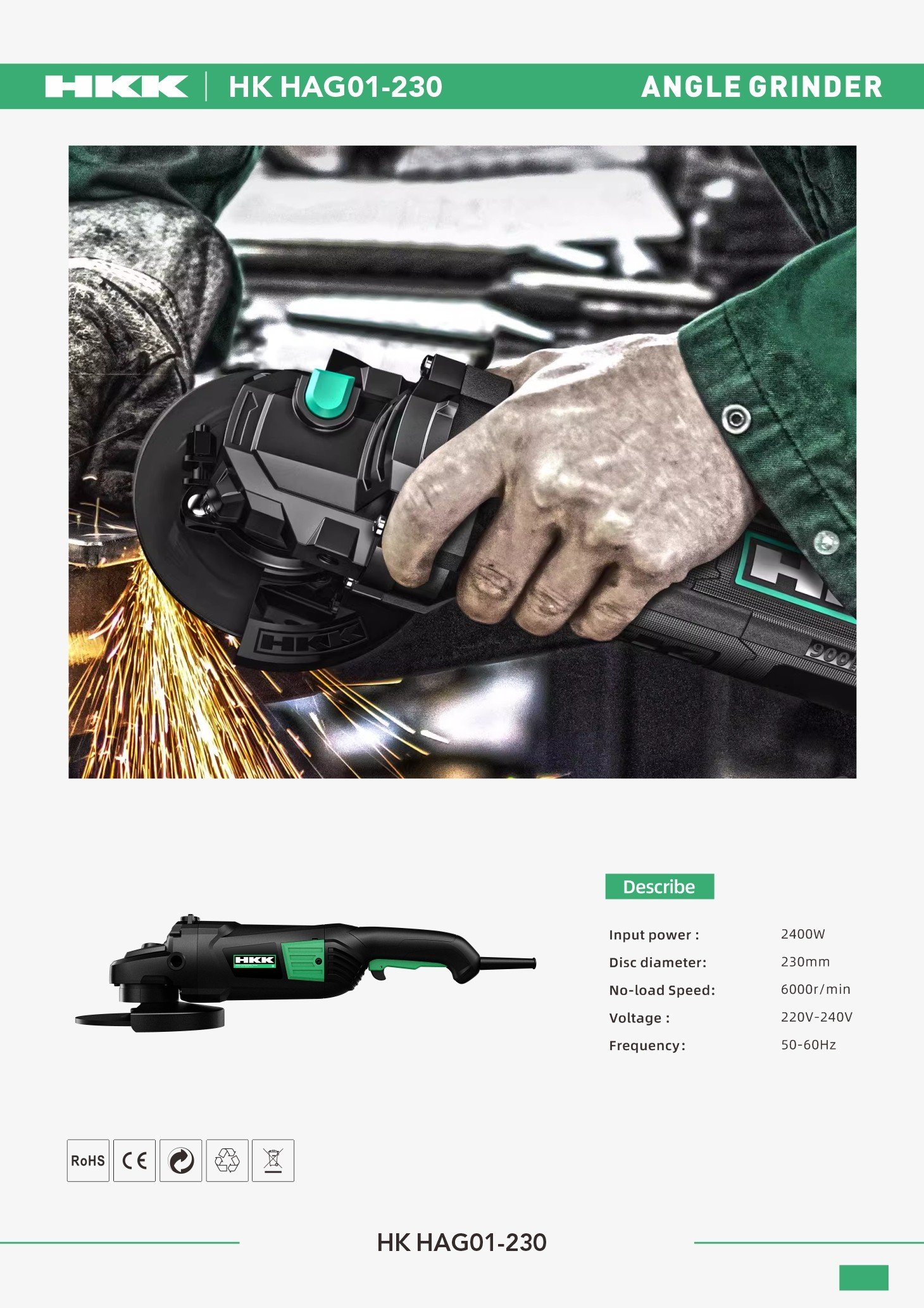 Disc diameter: 230mm Voltage & Frequency: 220V-240V & 50Hz-60Hz No-load Speed: 6000r/min Input power: 2400W