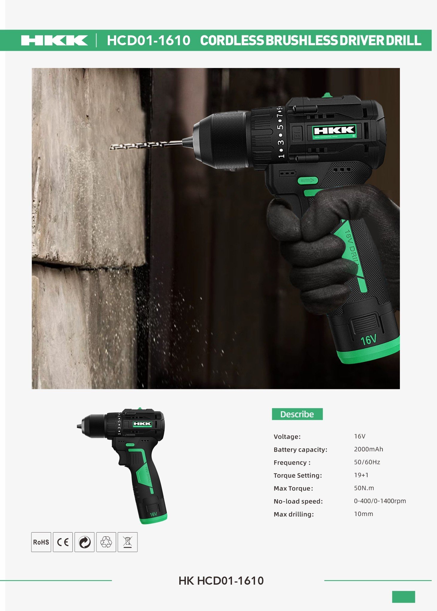 Voltage: 16V Battery capacity: 2000mAh Frequency: 50/60Hz Torque Setting: 19+1 Max Torque: 50N.m No-load speed: 0-400/0-1400rpm Max drilling: 10mm