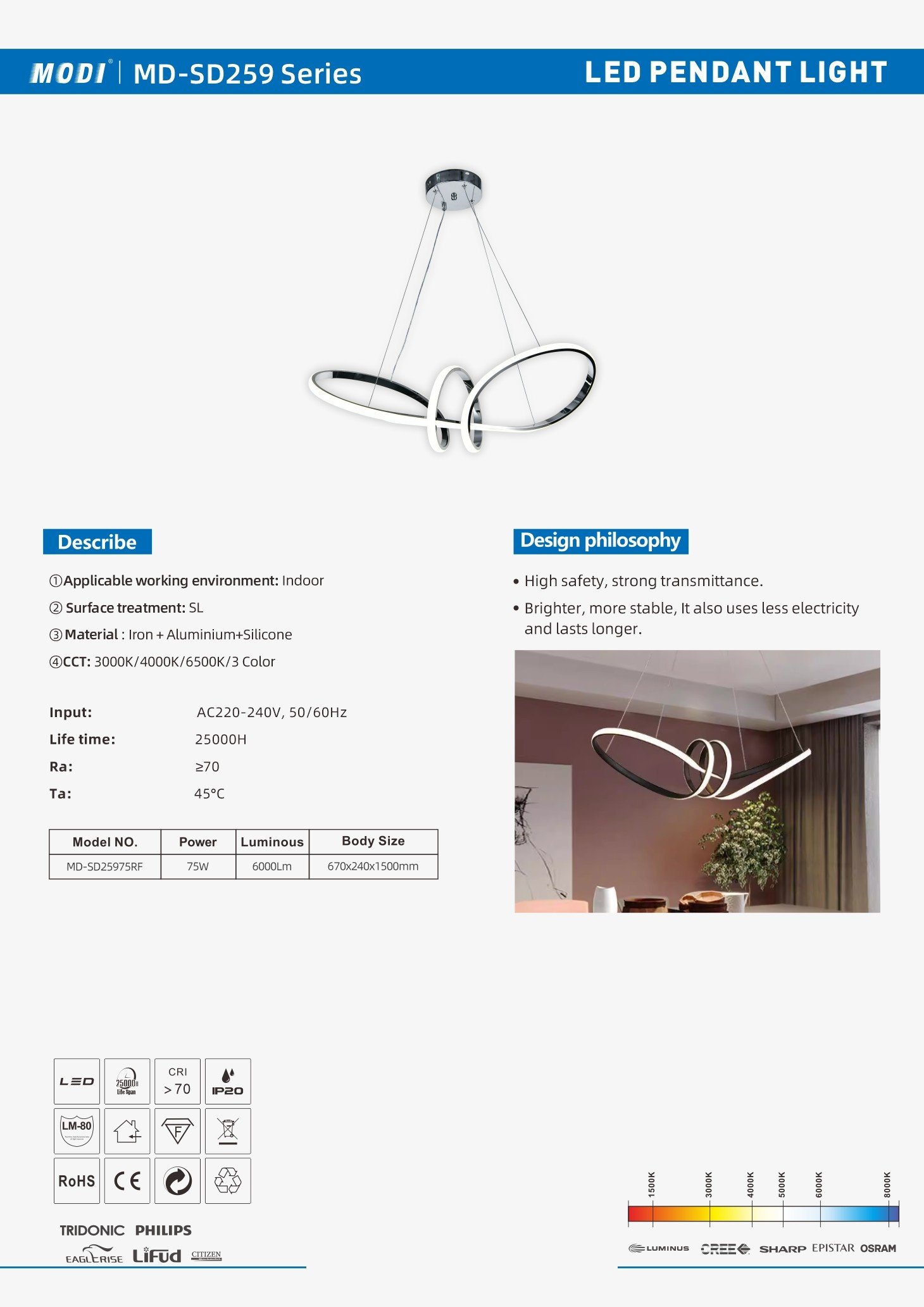 Voltage: AC220-240V 50/60Hz Power: 75W Life time: 25000H CRI: ≥70 Material: Iron + Aluminium+Silicone Body Size: 670x240x1500mm