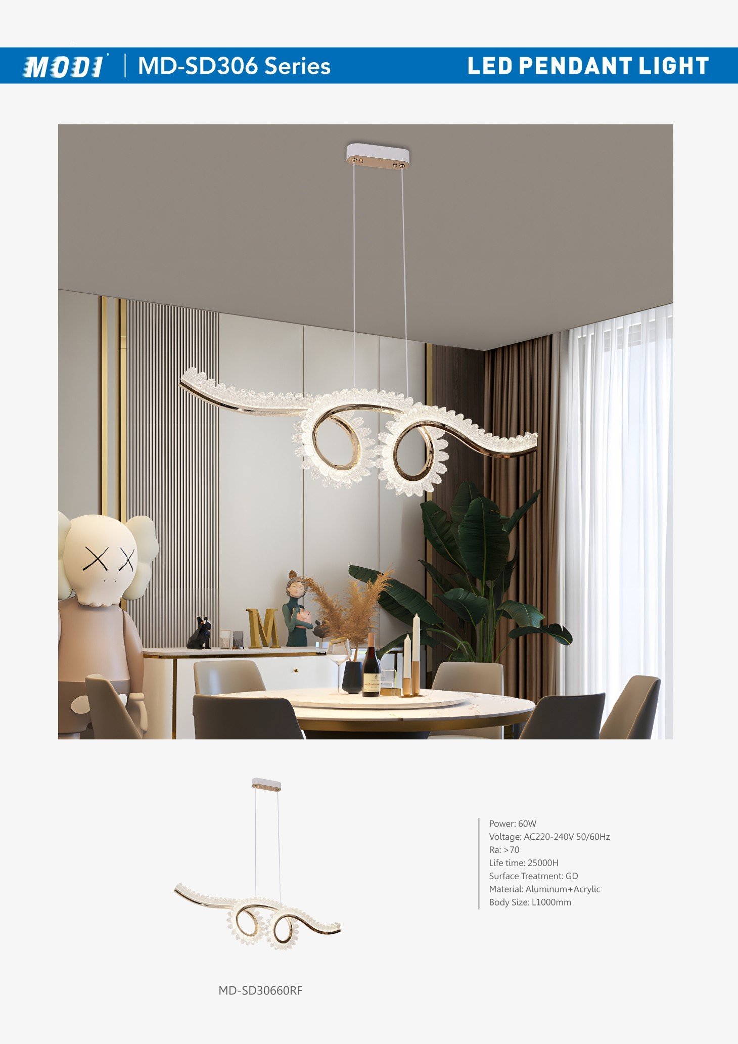 Voltage: AC220-240V 50/60Hz Power: 60W Life time: 25000H CRI: ≥70 Material: Aluminum+Acrylic Body Size: L1000mm