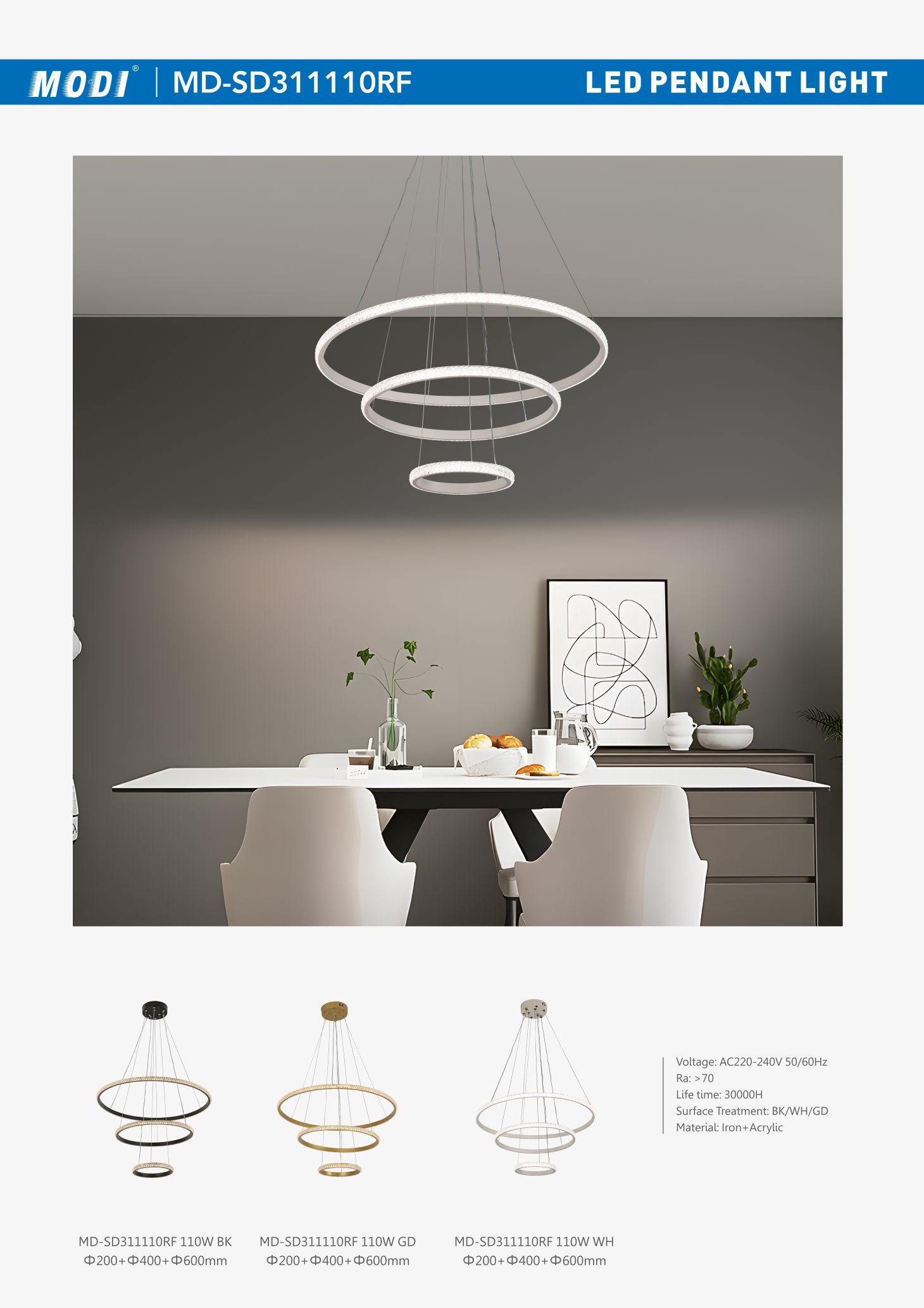 Voltage: AC220-240V 50/60Hz Power: 110W Life time: 30000H CRI: ≥70 Material: Iron+Acrylic Body Size: Φ200+Φ400+Φ600mm