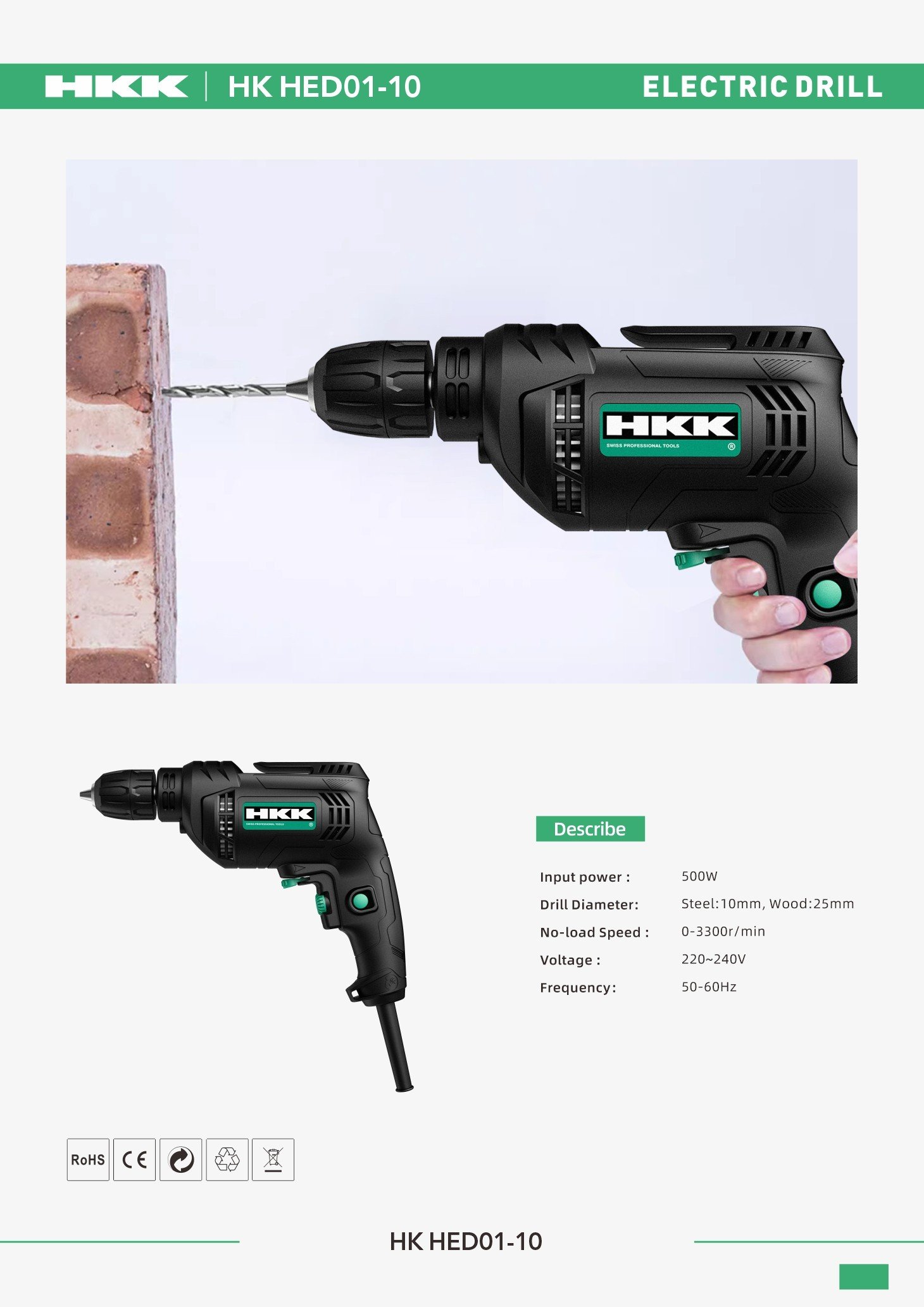 Input power: 500W Drill Diameter: Steel 10mm,Wood 25mm No-load Speed: 0-3300r/min Voltage: 220-240V Frequency: 50-60Hz