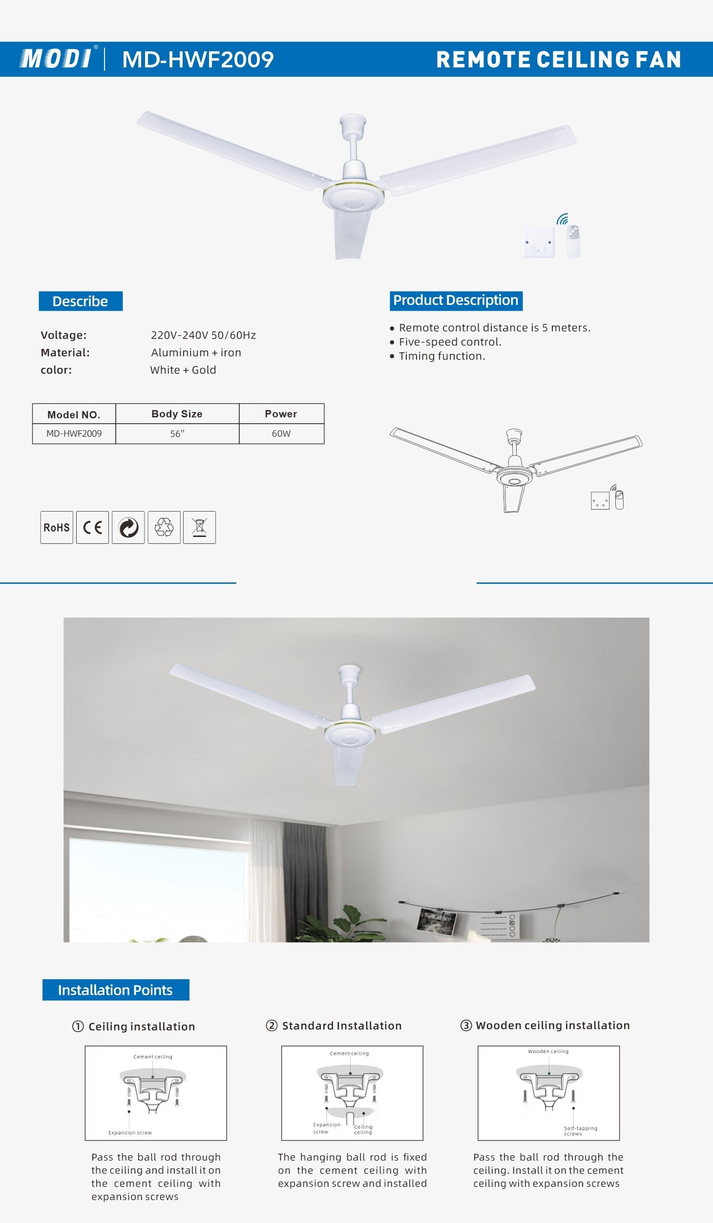 Voltage:220V-240V 50Hz Material: Aluminum + Iron Color:White + Gold Body Size:56” Power:60W