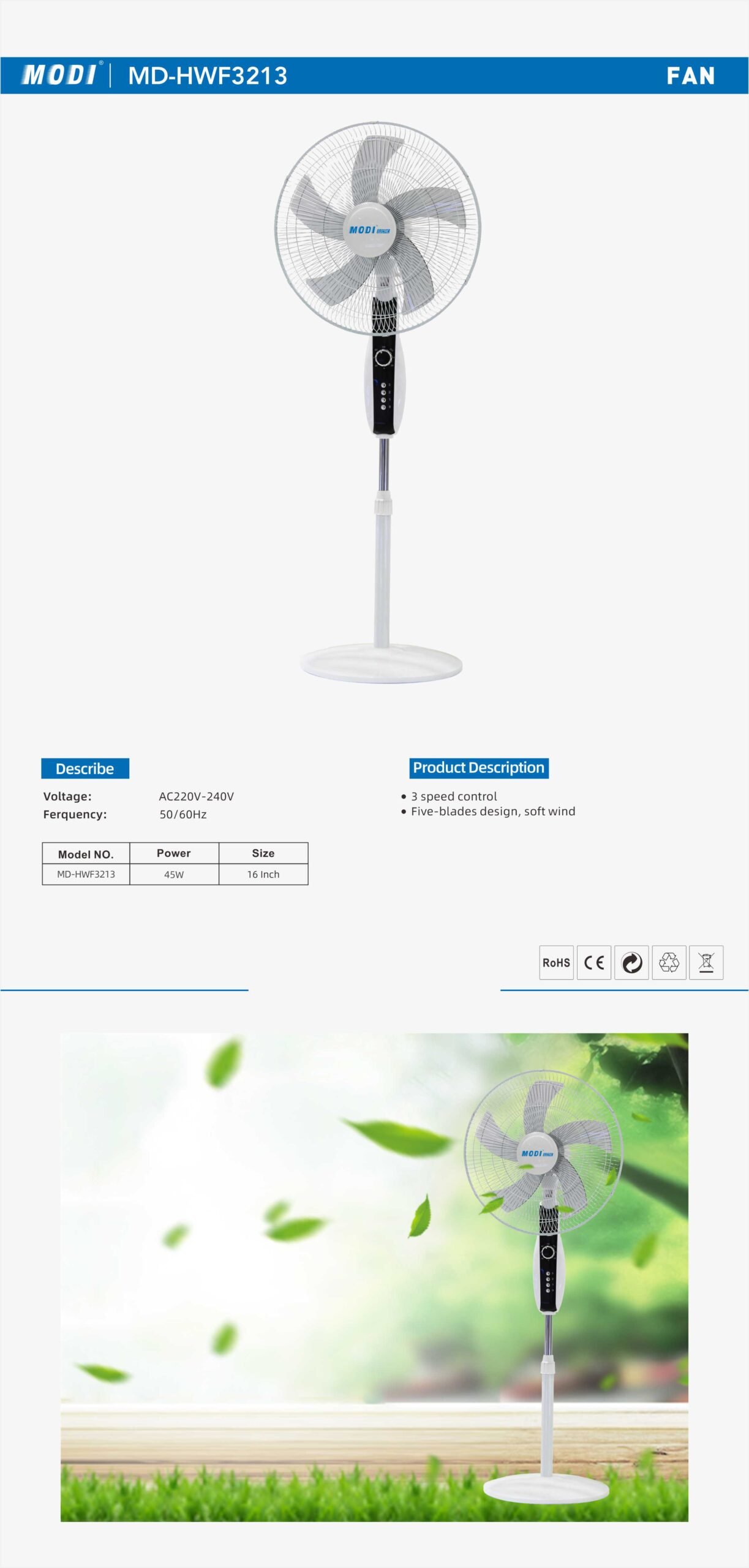Voltage: AC220-240V 50/60Hz Power:45W Size:16 Inch