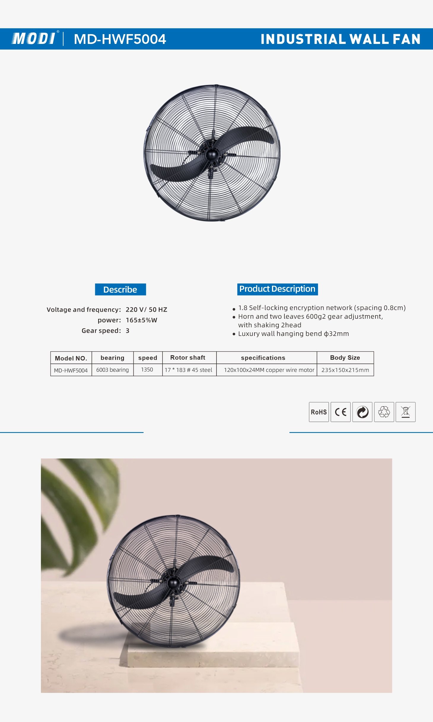 Voltage and frequency: 220V/ 50Hz power:165+5%W Gear speed: 3