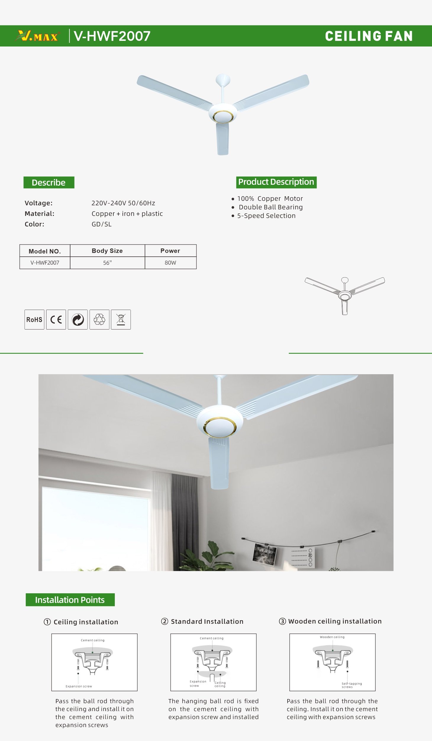 Voltage:220V-240V 50Hz Material: :Copper + iron + PC Color:GD/SL Body Size:56′ Power:80W