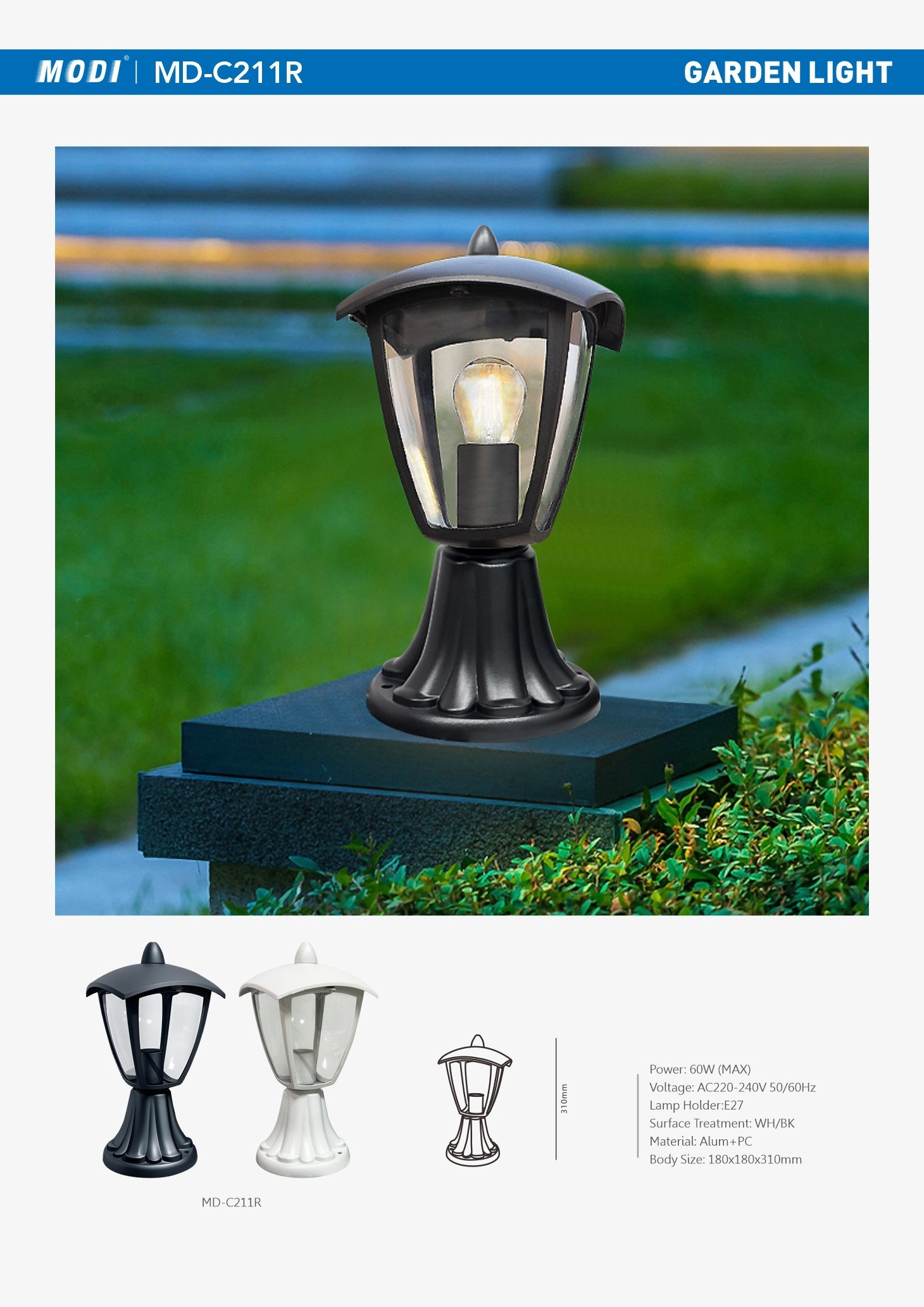 Power: E27 Voltage: AC220-240V 50/60Hz Surface Treatment: WH/BK Material: Alum+PC Body Size:180x180x310mm