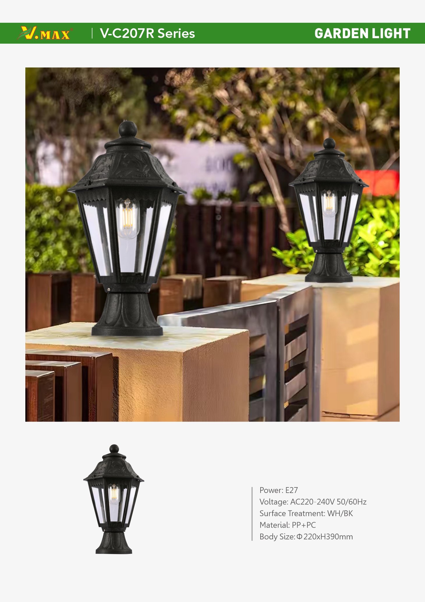 Power: E27 Voltage: AC220-240V 50/60Hz Surface Treatment: WH/BK Material: PP+PC Body Size:Φ220xH390mm