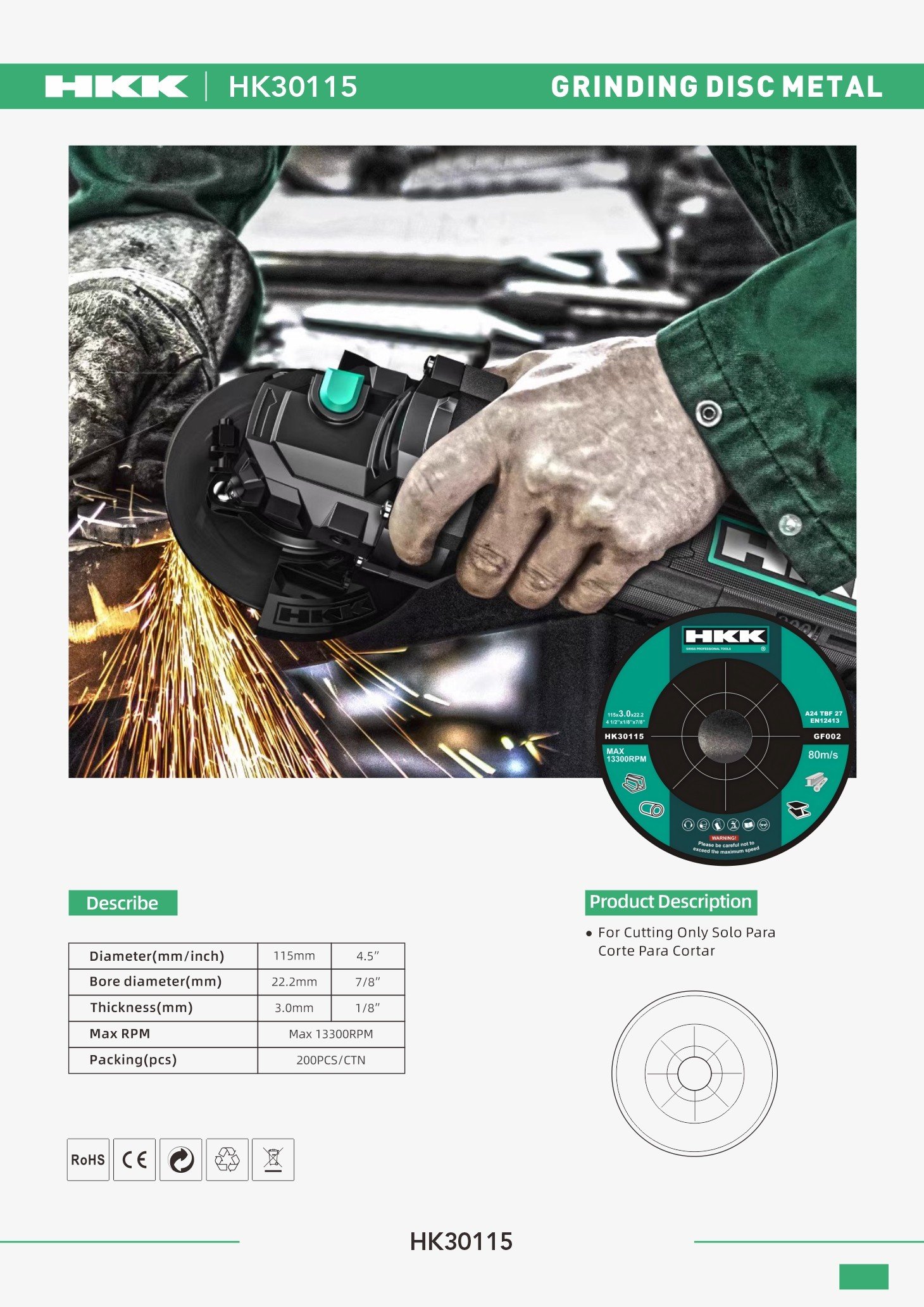 Diameter:4.5″ (115mm) Bore diameter:7/8″ (22.2mm) Thickness:1/8″ (3.0mm) Packing(pcs):200PCS/CTN