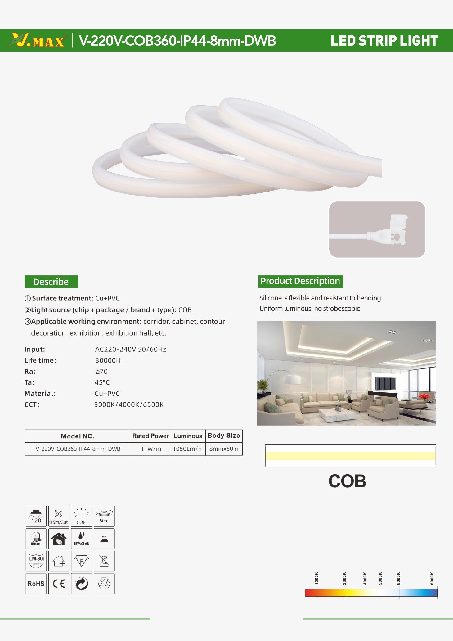 Voltage:AC220-240V 50/60Hz Chips:3535 chips Power:11w/m Beam Angle:120° Material:Cu+PC IP Grade:IP44 Body Size:8mmx50m