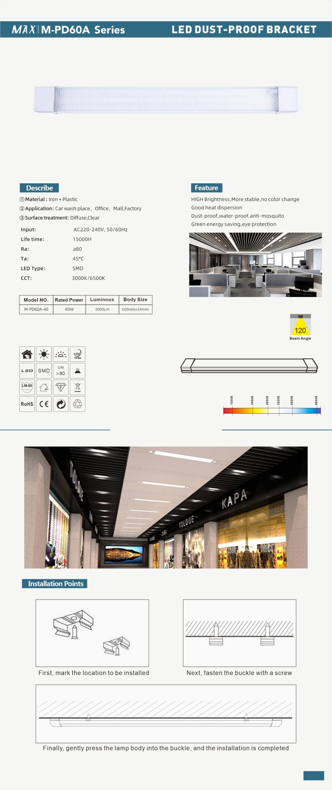 Voltage: AC220-240V 50/60H Power: 40W CRI: ≥80 Luminous:3000Lm Beam Angle: 120° LED Type: SMD Material: Iron+PC Body Size:600x66x24mm