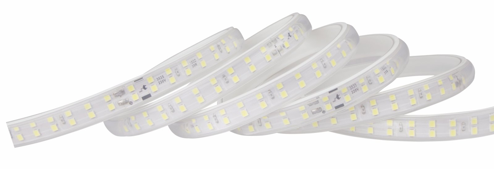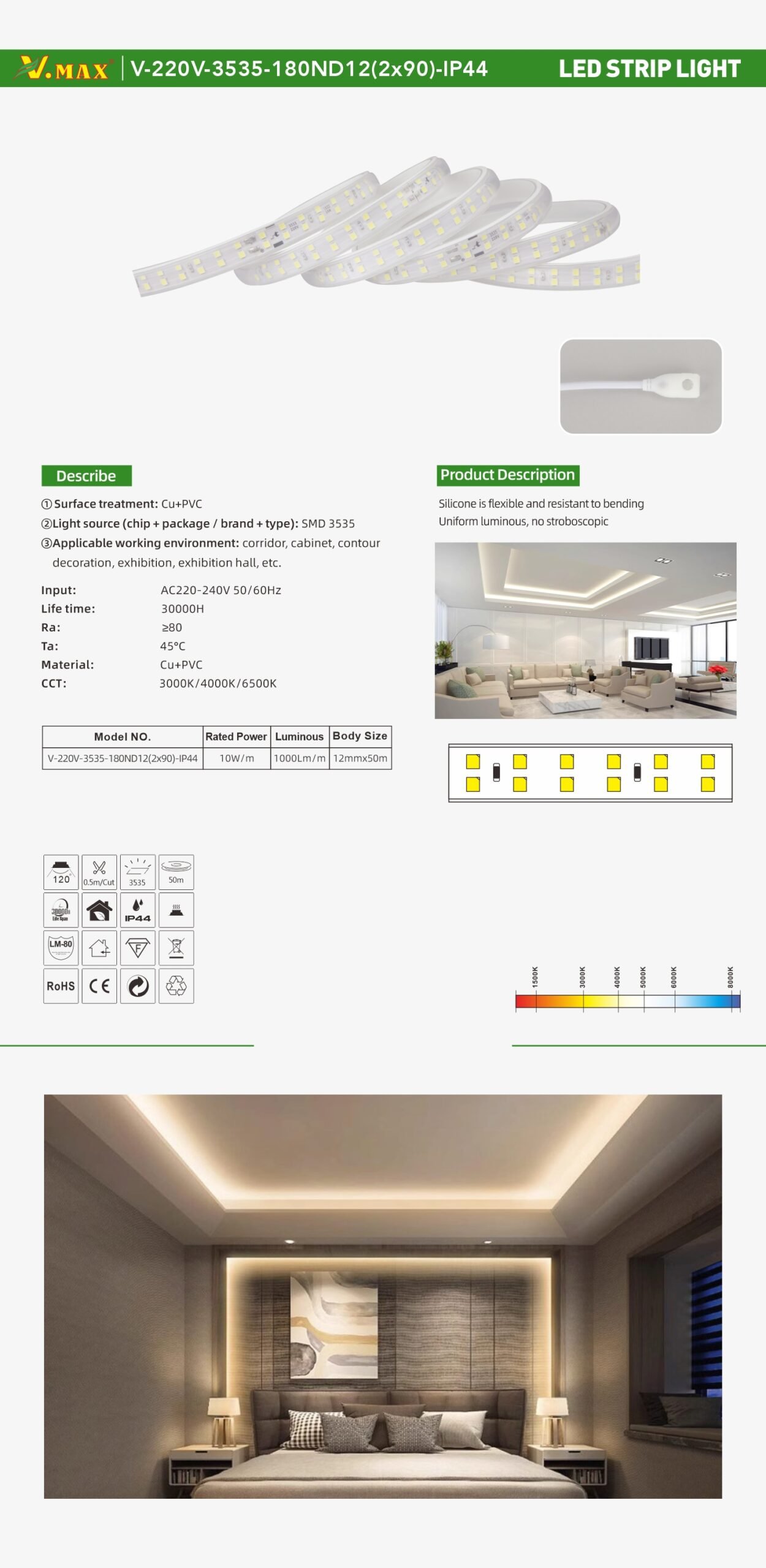 Voltage:AC220-240V 50/60Hz Chips:3535 chips Power:10w/m Beam Angle:120° Material:Cu+PC IP Grade:IP44 Body Size:12mmx50m