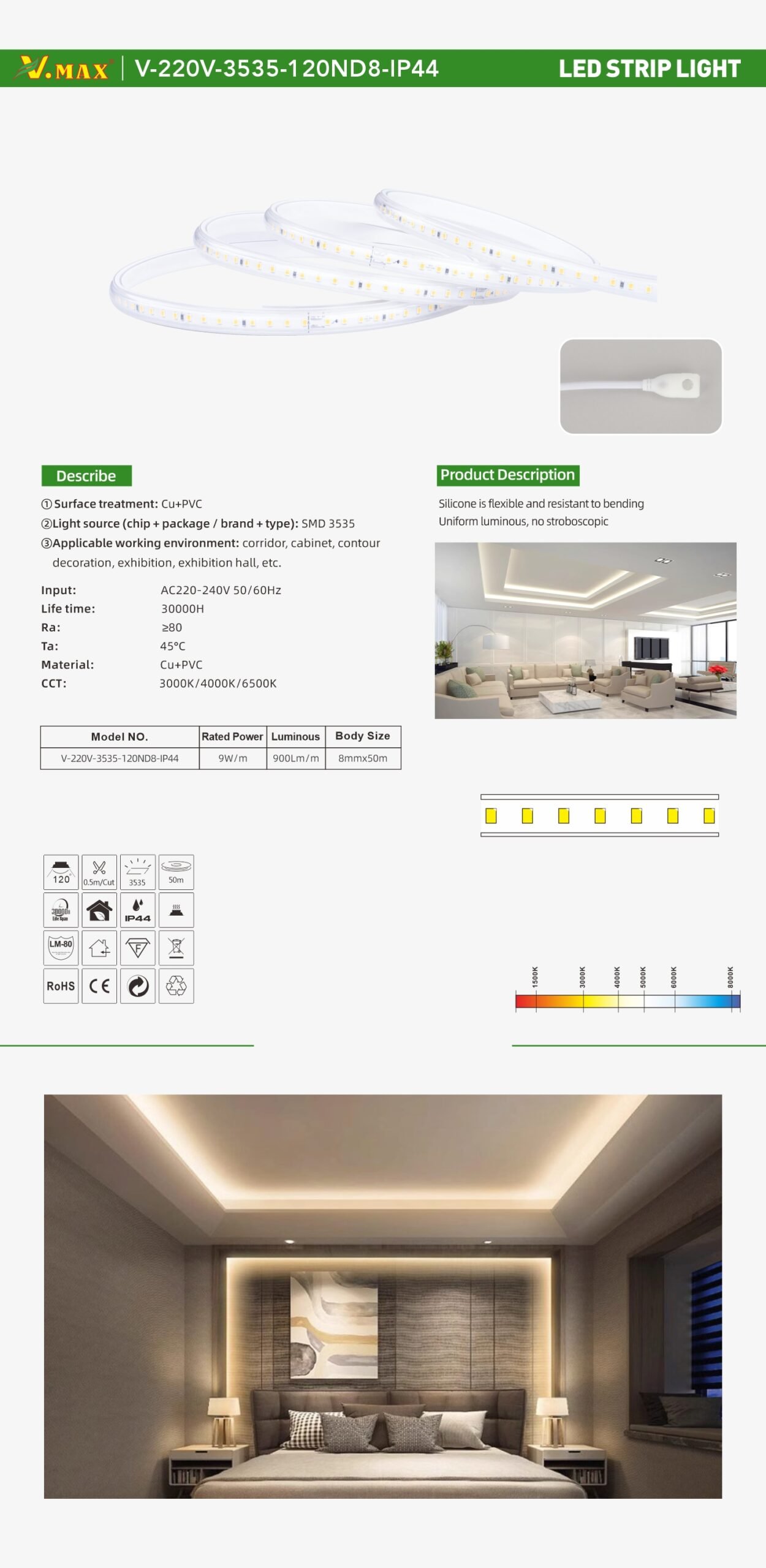 Voltage:AC220-240V 50/60Hz Chips:3535 chips Power:9w/m Beam Angle:120° Material:Cu+PC IP Grade:IP44 Body Size:8mmx50m