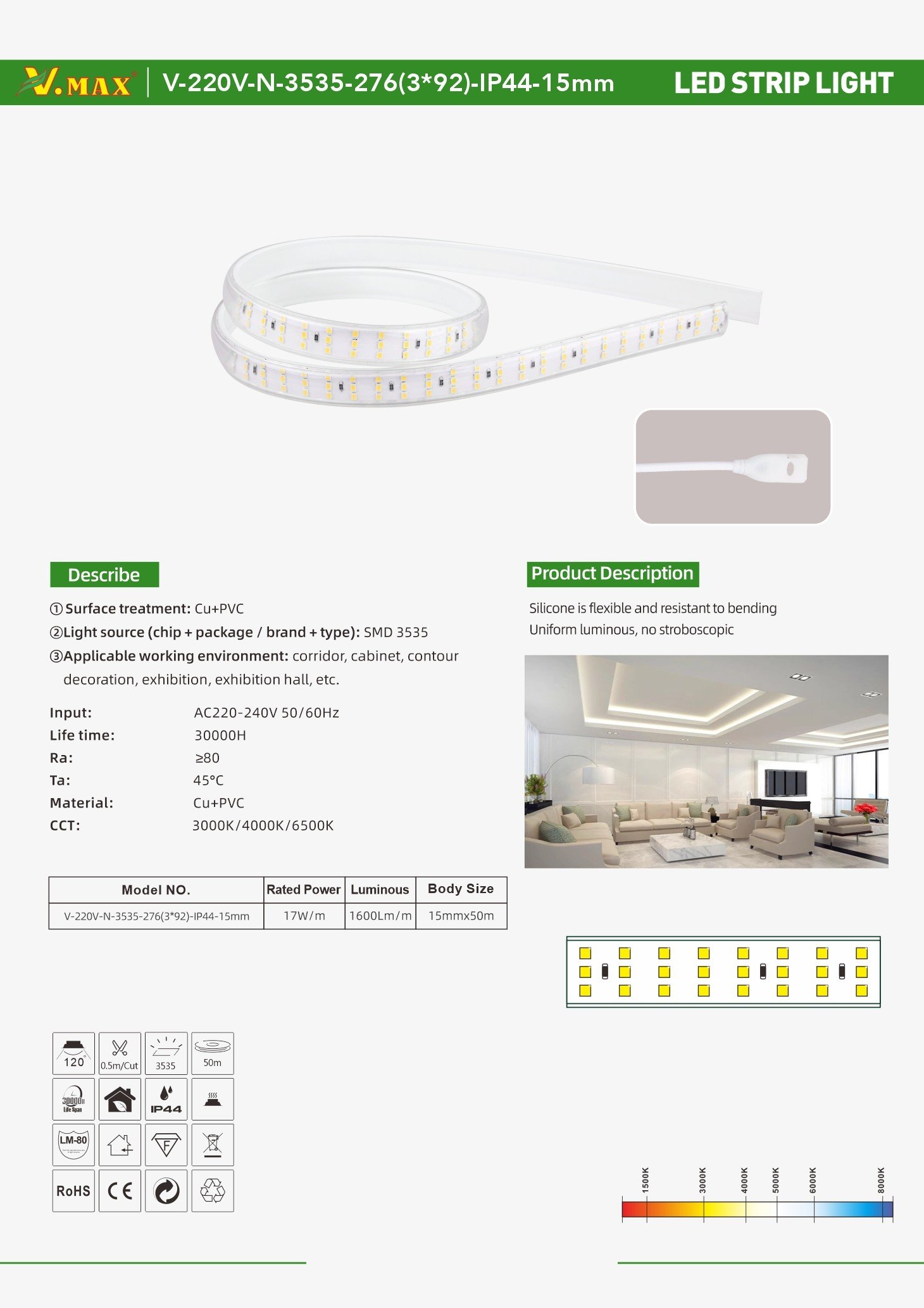 Voltage:AC220-240V 50/60Hz Chips:3535chips Power:17w/m Beam Angle:120° Material:Cu+PC IP Grade:IP44 Body Size:15mmx50m
