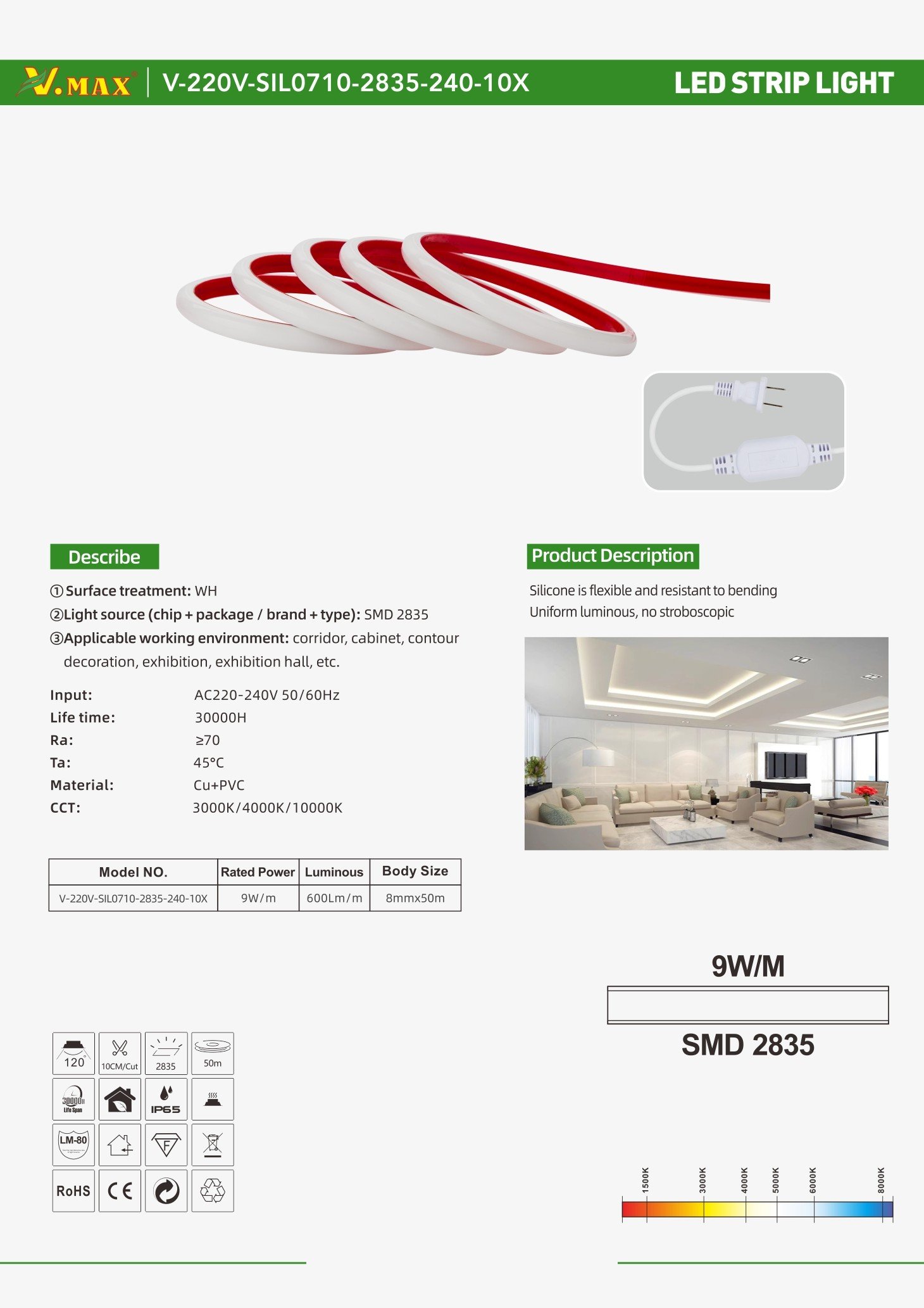 LED tape, LED strip light V-220V-SIL0710-2835-240-10X-IP65 Series