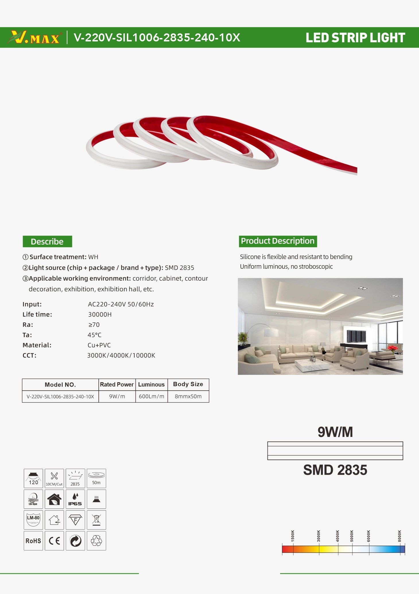 LED tape, LED Strip light V-220V-SIL1006-2835-240-10X-IP65 Series