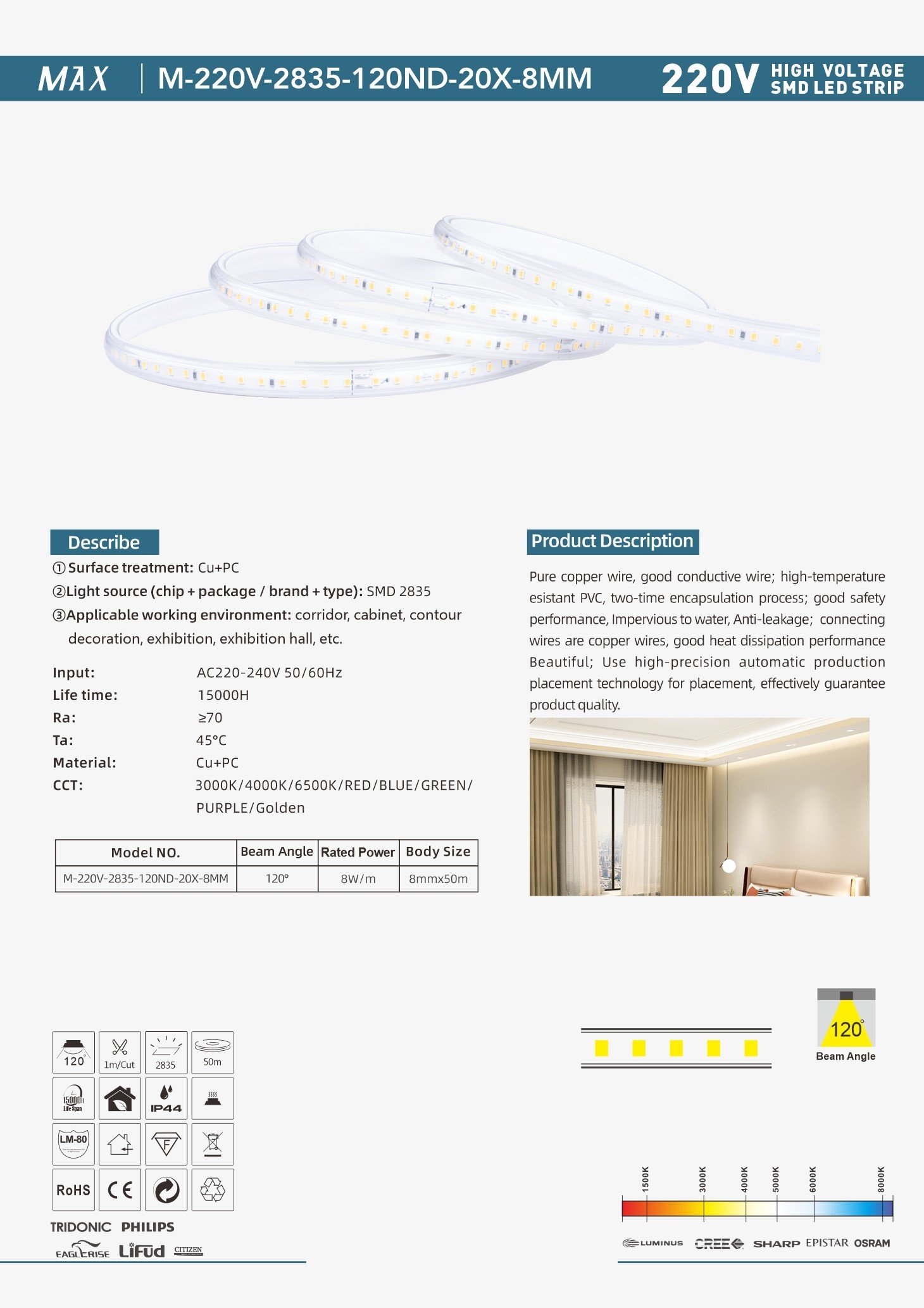 VoltageAC220-240V 50/60Hz Chips:2835chips Power:8w/m Beam Angle:120° Material: Cu+PC IP Grade:IP44 Color:3000K/4000K/6500K/RED/BLUE/GREEN/PURPLE/Golden Body Size:8mmx50m