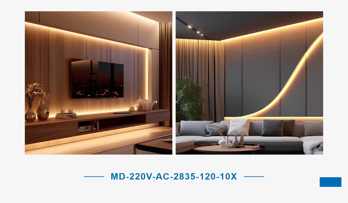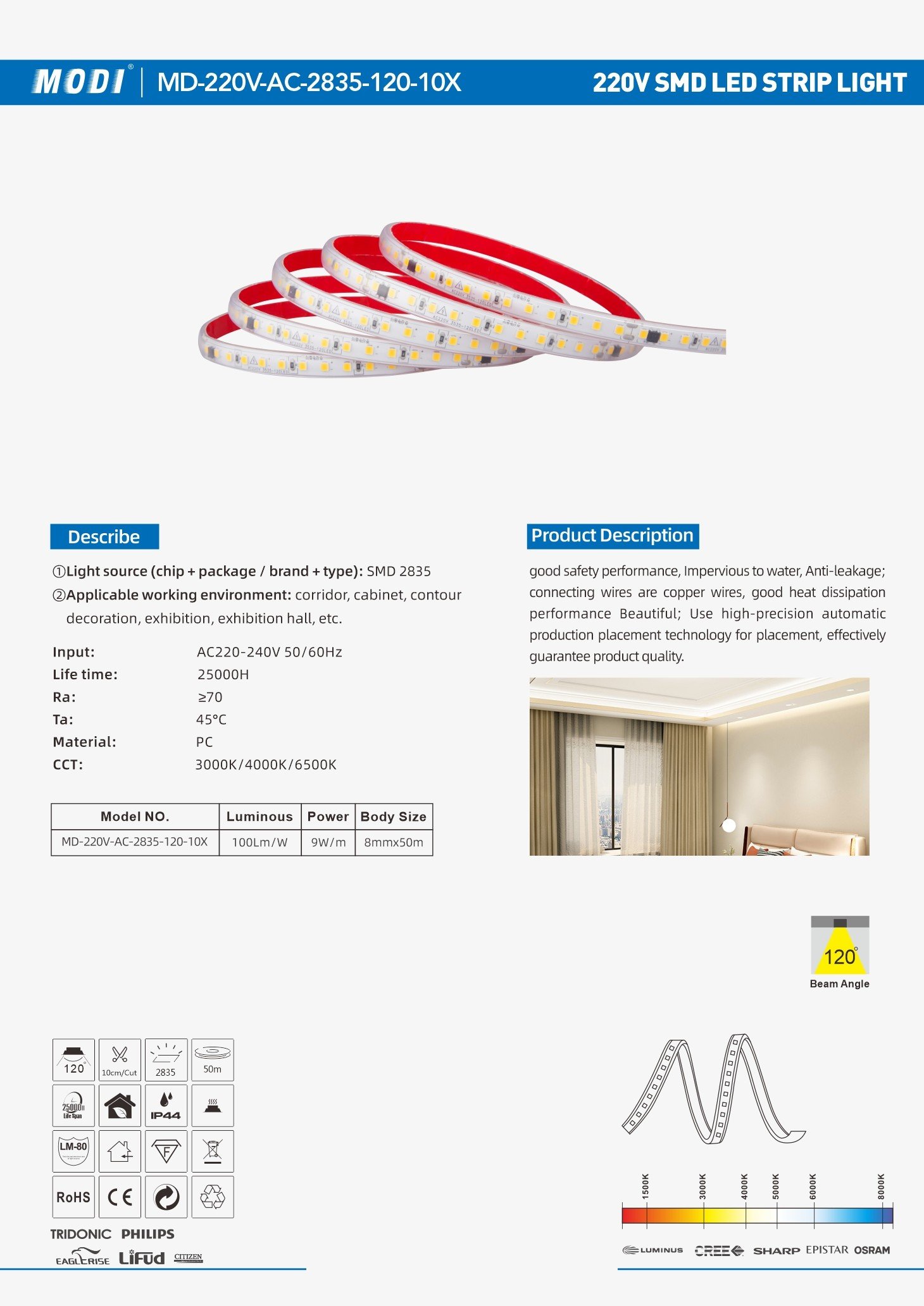 Input Voltage: AC220-240V 50/60Hz Chips: 2835chips Power: 9w/m Beam Angle: 120° Material: PC IP Grade: IP44 Body Size: 8mmx50m