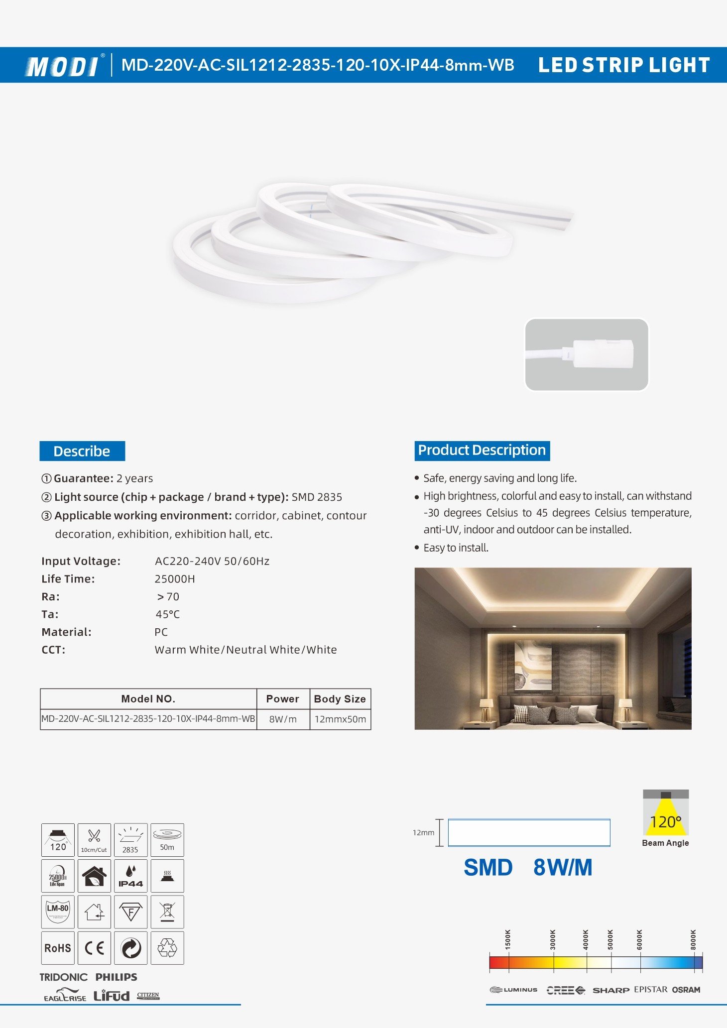 Input Voltage: AC220-240V 50/60Hz Power: 8W/M LED Type: SMD 2835 CRI: >70 Beam Angle: 120° Material: PC Body Size: 12mmx50m IP Grade: IP44