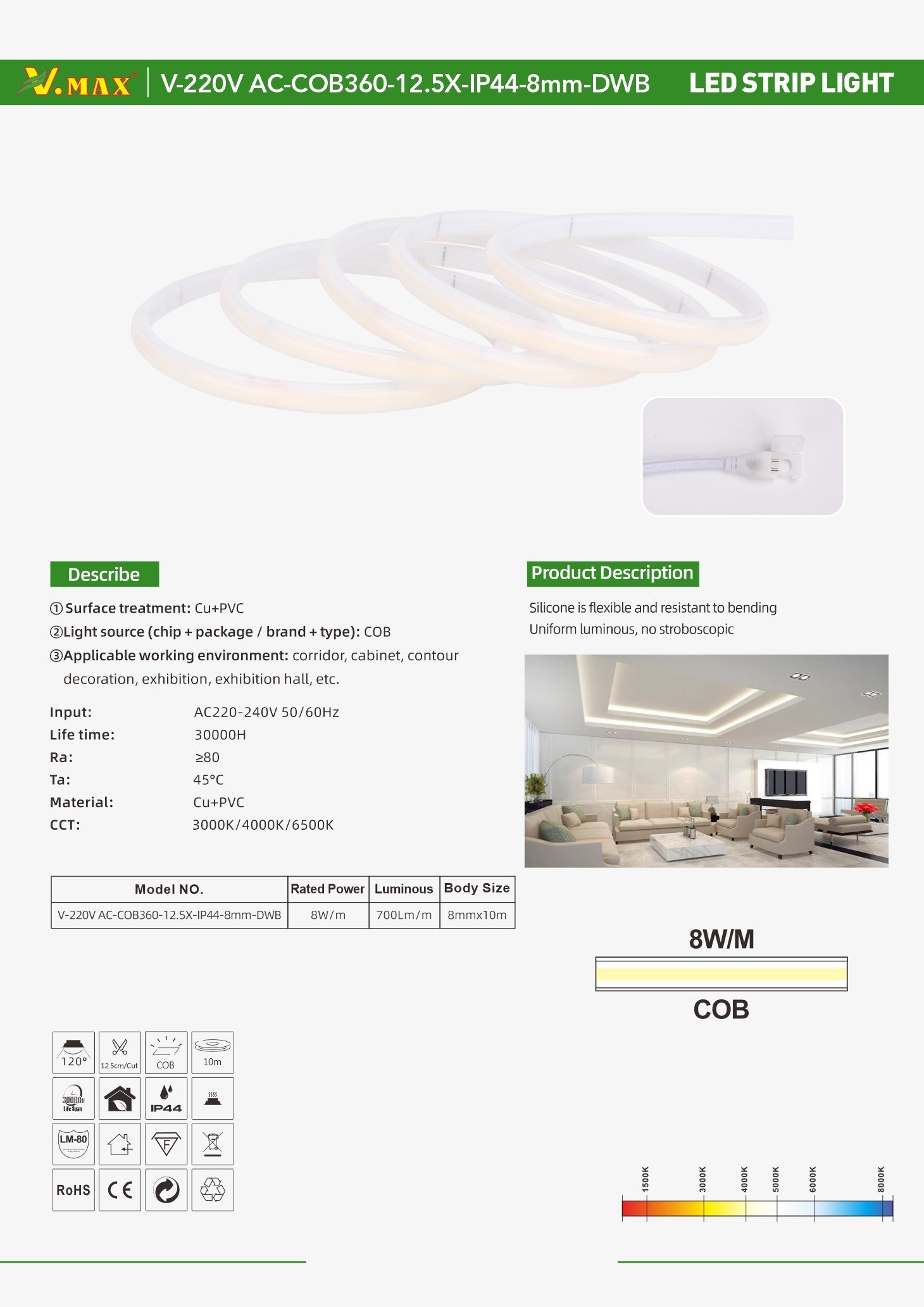 Voltage:AC220-240V 50/60Hz Chips:COB Power:8w/m Luminous:700Lm/m Beam Angle:120° Material: Cu+PC IP Grade:IP44 Body Size:8mmx10m