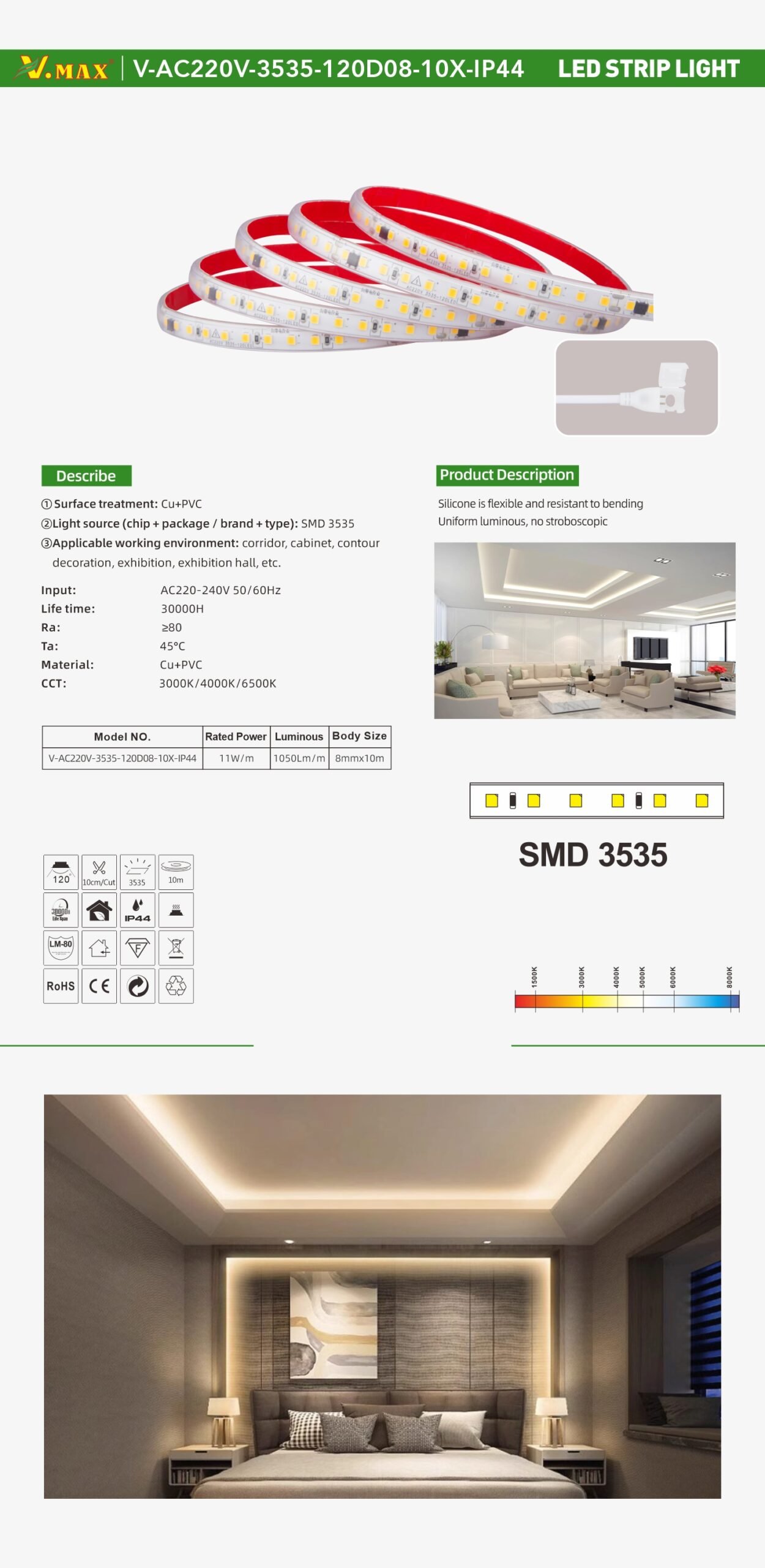 VoltageAC220-240V 50/60Hz Chips:3535 chips Power:11w/m Beam Angle:120° Material: Cu+PC IP Grade:IP44 Body Size:8mmx10m