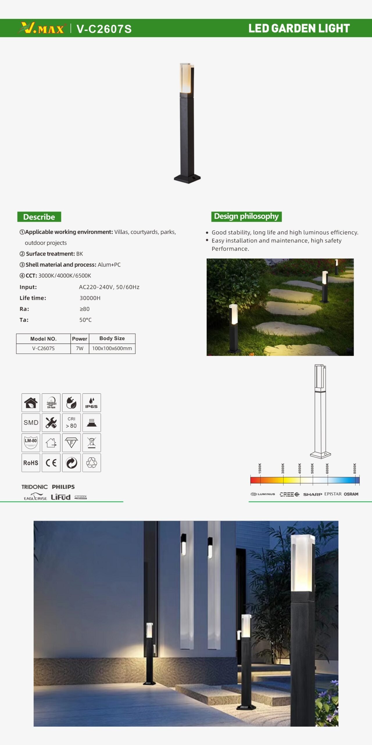 Voltage: AC220-240V 50/60Hz Power: 7W CRI: ≥80 Beam Angle: 120° PF: >0.5 Surge: 2KV Material: Aluminum+Acrylic Body Size:100x100x600mm