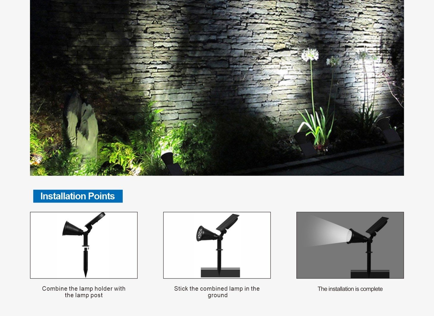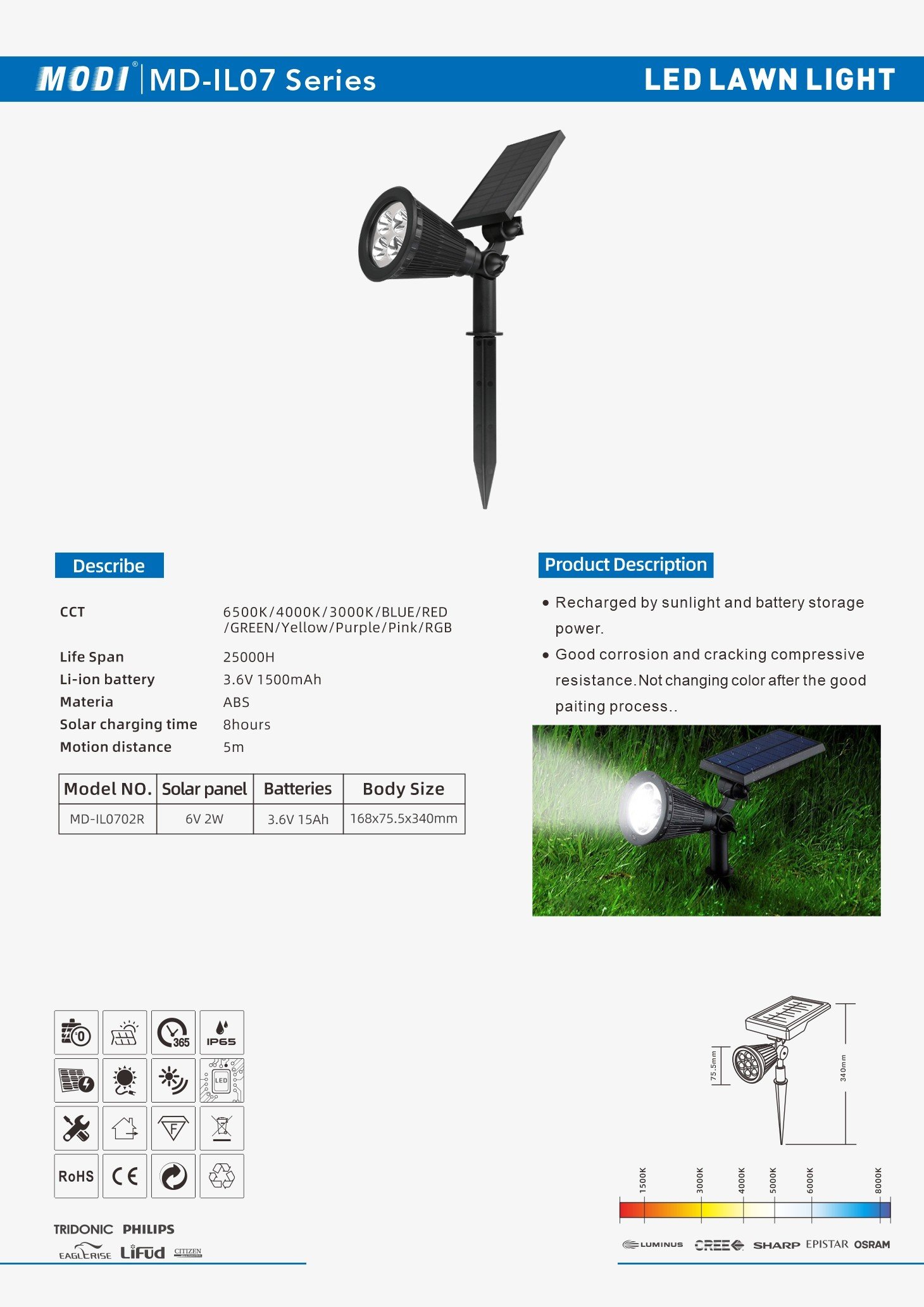 Life Span :25000H LED Type: 2W SMD LED lighting Battery: 1500mAH NI-MH 3.6V Duration time: 6-8hours installation: Insert the ground Solar panel:6V2W Body Size:168×75.5x340mm Materia:ABS Motion distance:5m