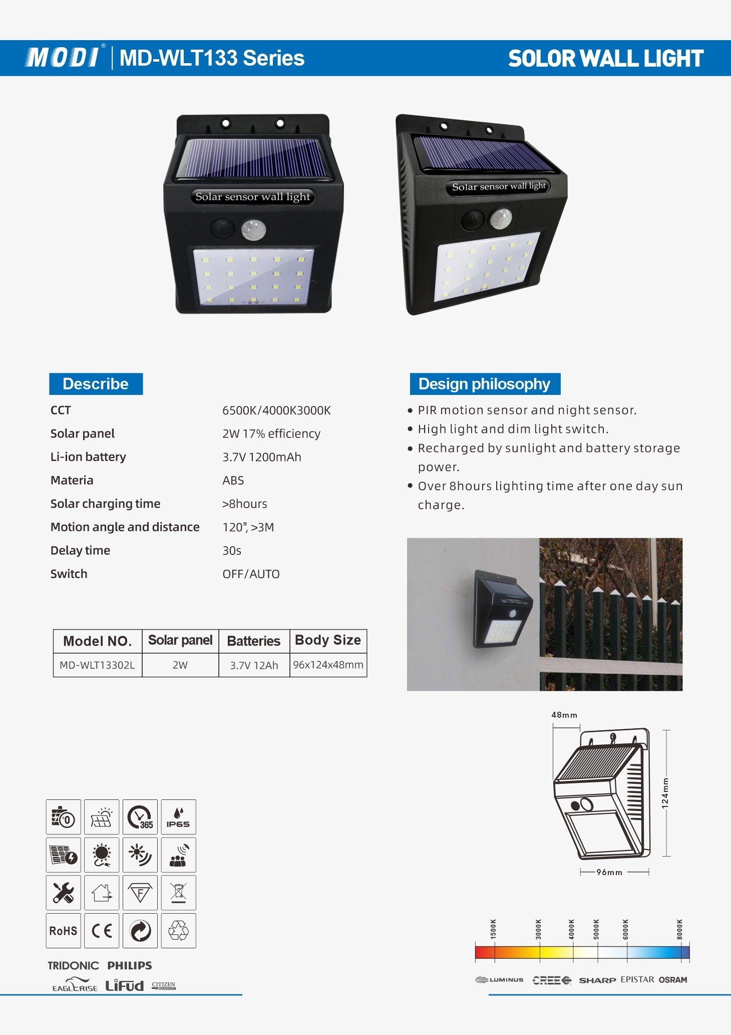 Solar panel: 2W 17% efficiency Li-ion battery 3.7V 1200mAh Material: ABS Solar charging time: >8hours Motion angle and distance: 120°, >3M Delay time: 30s Body Size:96x124x48mm Switch:OFF/AUTO Working mode:Automatic light sensor control