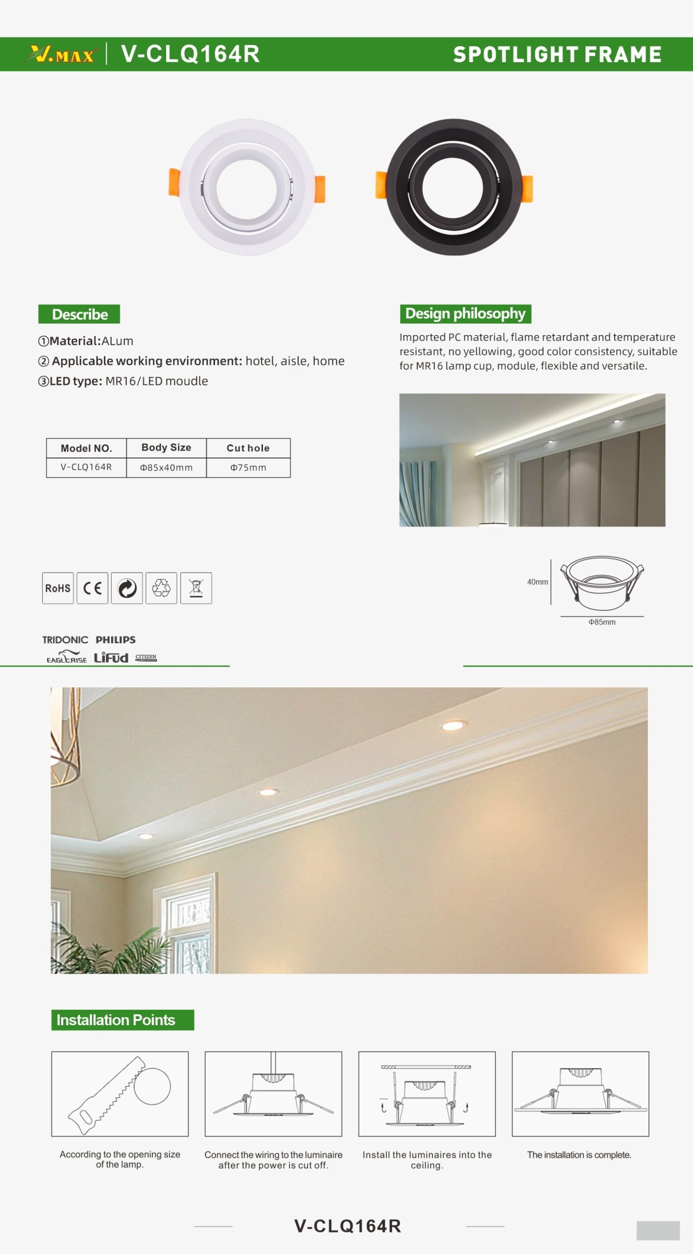 Material:Aluminum LED type : MR16/LED Moudle Body Size:Ф85x40mm Hole Size:Ф75mm