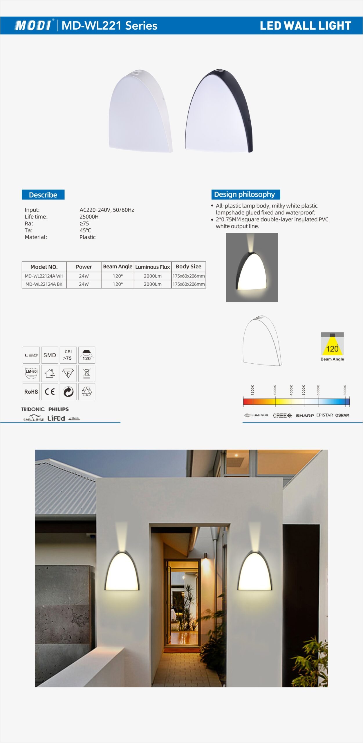 Voltage: AC220-240V 50/60Hz Power: 24W CRI: ≥75 Luminous: 2000Lm Beam Angle: 120° LED Type: SMD Material: PC Body Size:175x60x206mm