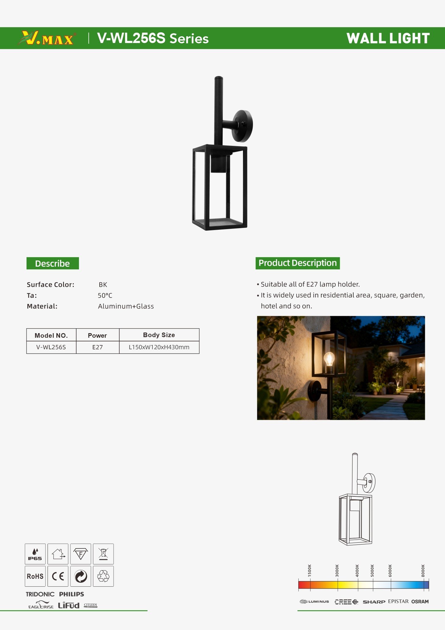 Power: E27 Surface treatment: BK IP Grade: IP65 Material: Aluminum+Glass Body Size: L150xW120xH430mm
