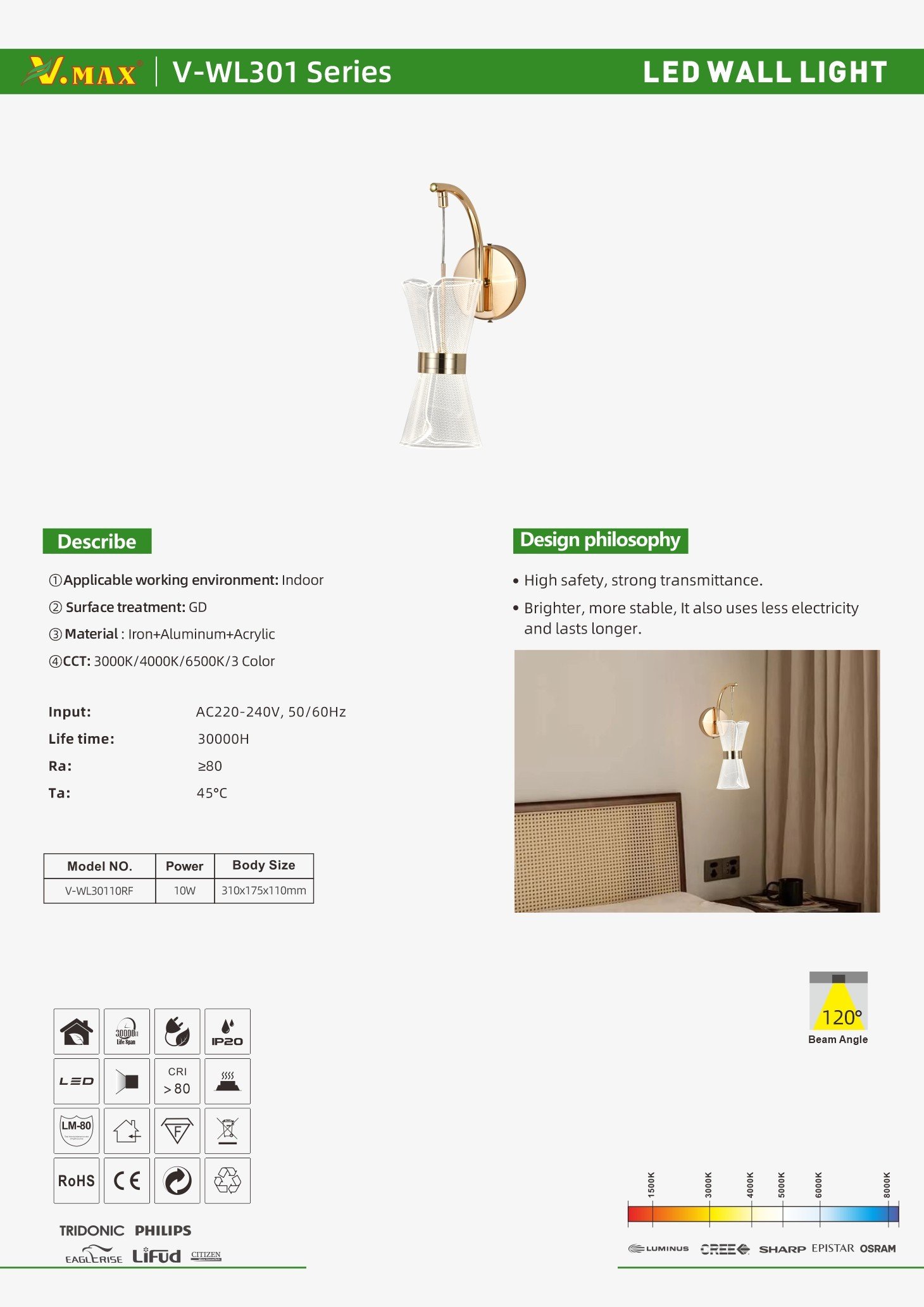 Voltage: AC220-240V 50/60Hz Power: 10W CRI: ≥80 Beam Angle: 120° PF: >0.5 Surge: 1.5KV Material: Iron+Aluminum+Acrylic Body Size: 310x175x110mm